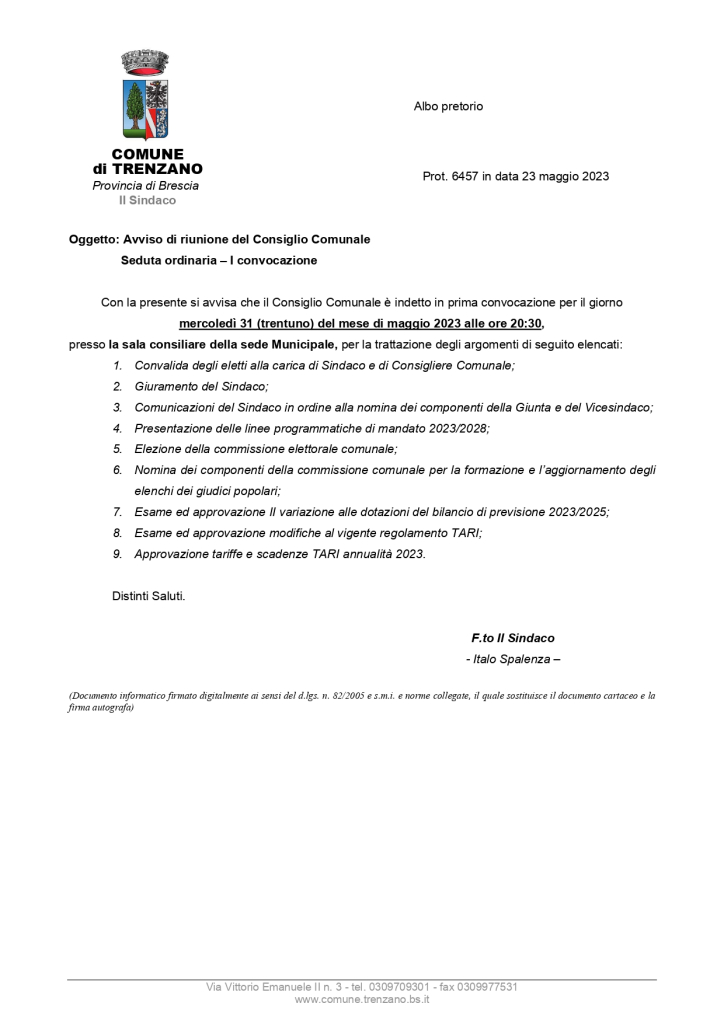 Si pubblica l’avviso di convocazione del Consiglio Comunale in prima convocazione 31 maggio 2023 alle ore 20:30 presso la Sala consiliare della sede Municipale.