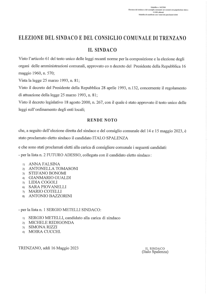 Si pubblica copia dell’avviso di proclamazione degli eletti in esito alle consultazioni elettorali amministrative del 14 e 15 maggio 2023.
