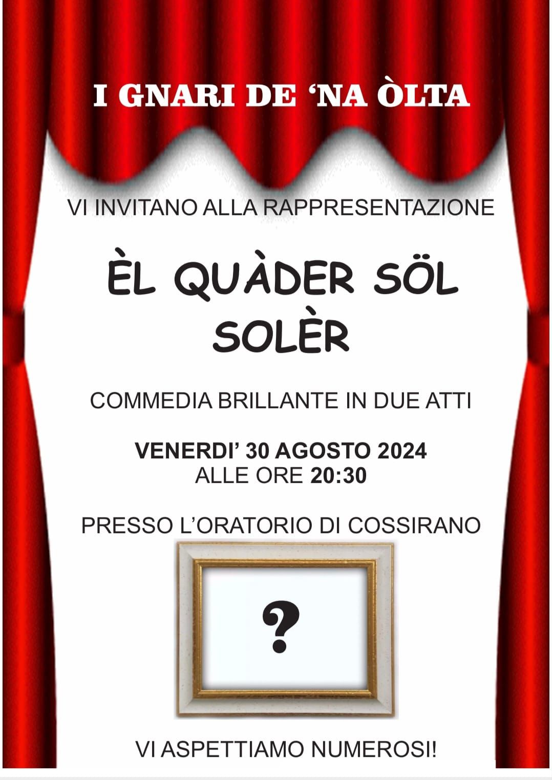 Si pubblica la locandina dell'evento-commedia "El quader sol soler", in programma per il 30 agosto alle 20,30 presso l'oratorio di Cossirano.