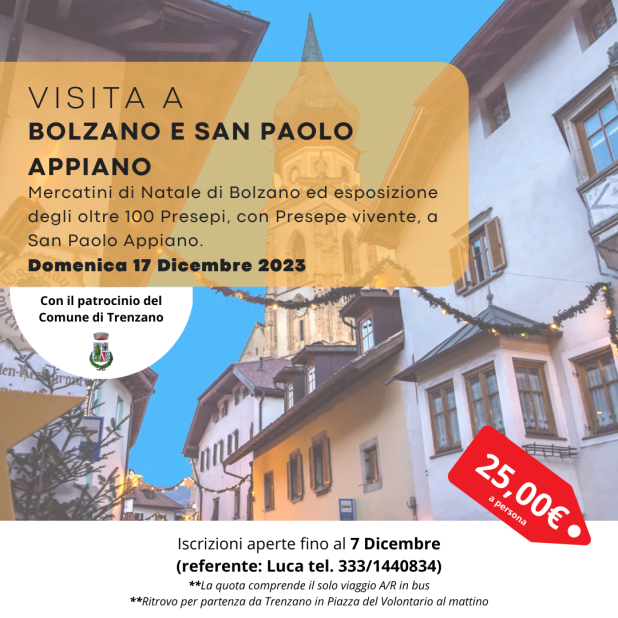 Il Comune di Trenzano patrocina il nuovo viaggio a Bolzano e a San Paolo Appiano, con visita ai mercatini di Natale alla mostra dei presepi e al Presepe vivente per il prossimo 17 dicembre.